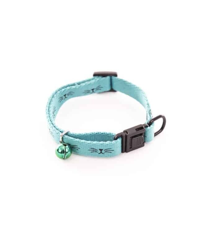 Collier avec motifs de moustaches, une boucle anti-étranglement et un grelot assorti.