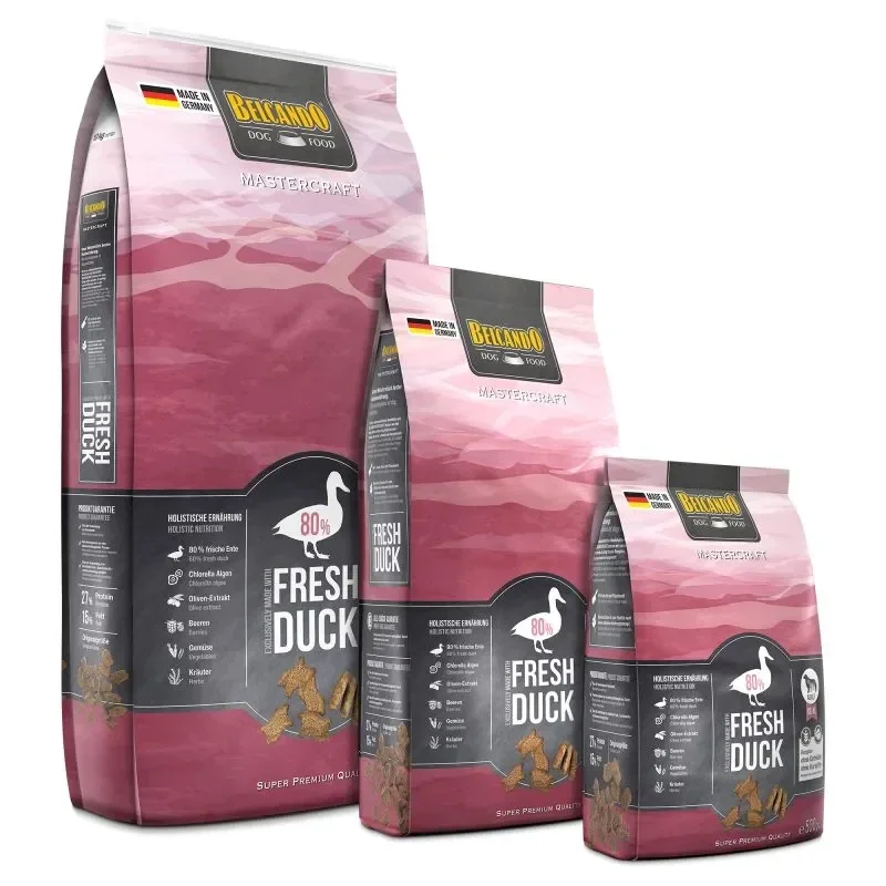 Composition : viande fraîche de canard (80 %); amarante (5,5 %); farine de pois; farine de fève (Vicia faba); pois chiches, séchés; levure de bière, séchée (1 %, source de bêta-glucanes et mannane- oligosaccharides); plancton de mer, moulu (krill, 0,8 %); gousses de caroube, séchées; marc de pommes, séché; phosphate bicalcique; graine de chia (0,4 %); légumes, séchés (total : 0,3 %; carottes, panais, betterave rouge, poireau); maërl (Algues marines calcaires) (0,3 %, Lithothamnium calcareum); foie de volaille, hydrolysé; algues séchées (0,2 %, Chlorella vulgaris); chlorure de sodium; canneberges (0,06 %); myrtilles, séchées (total : 0,06 %; sorbiers, cynorrhodons, myrtilles, baies de sureau, cassis); herbes, séchées (total : 0,06 %; feuilles d´ortie, racines de gentiane, petite centaurée, camomille, fenouil, cumin, herbe de gui, herbe de millefeuille, feuilles de mûres); chlorure de potassium; yucca schidigera; extrait d´olives (0,003 %, Olea europaea)