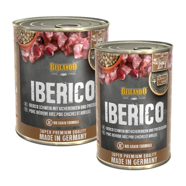 Composition : viande, poumon, foie, rein, rate de porc ibérique (65 %); bouillon de viande (25,5 %); pois chiches, cuit (5 %); airelles (2 %); graine de chia (1 %); coquilles d’oeufs séchées (0,5 %); substances minérales (0,5 %); huile de carthame (0,5 %)