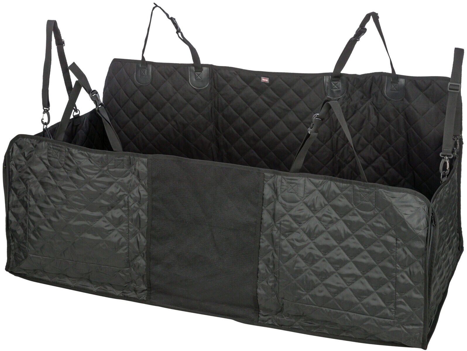 - les parties latérales peuvent être rabattues grâce aux deux fermetures éclairs ; protègent les revêtements intérieurs