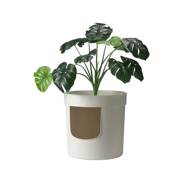 Caisse à chat fermée ressemblant à un vrai pot de fleur.